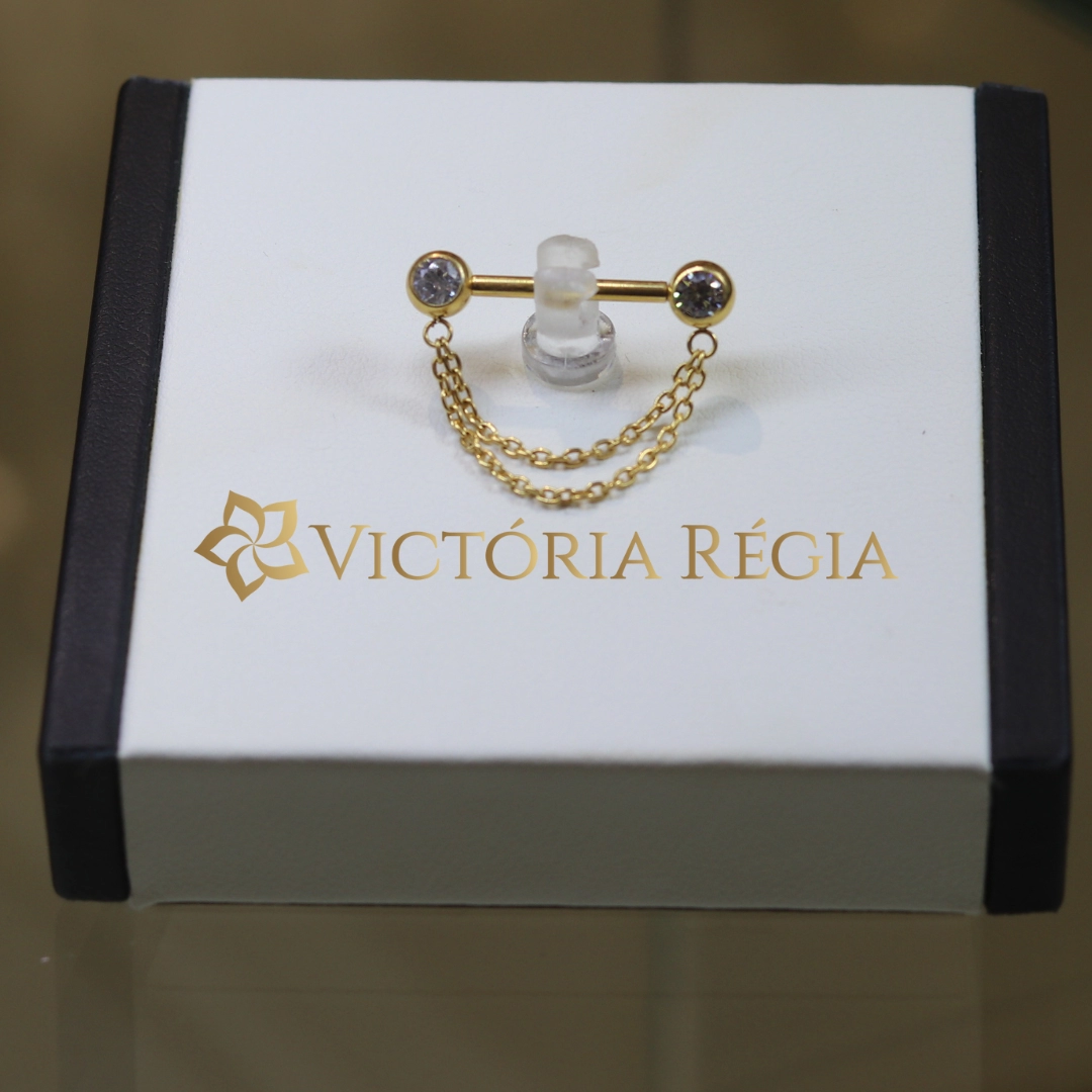 Piercing Mamilo - Microbell Reto com MicroZircônia e Correntaria em Titânio com PVD Gold